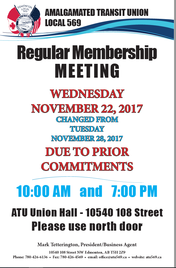 News LAPP Update 2017-11-21 Read More Anti-Privatization Update 2017-11-14 Read More Regular Membership Meeting Wednesday, November 22, 2017 2017-11-09 Read More UPDATE – ATU Winter Family Event 2017-11-02 Read More Update ATU Winter Family Event 2017-11-02 Read More Vendor Market & Christmas Campaign 2017-10-30 Read More ATU Winter Family Event 2017-10-25 Read More ETS service to the Airport UPDATE 2017-09-08 Read More August 2017 Assault Statistics 2017-09-06 Read More Blind Spot News 2017-07-18 Read More Privatization Campaign Update 2017-06-09 Read More Long Term Disability Fund Update 2017-06-06 Read More Anti-Privatization of Public Transit 2017-06-05 Read More Anti-Privatisation Campaign of Edmonton Transit 2017-05-31 Read More Membership Meeting – May 23rd, 2017 2017-05-11 Read More « Newer 1 2 3 4 … 13 14 15 16 17 18 19 20 Older » Share this:Share Click to share on Facebook (Opens in new window) Facebook